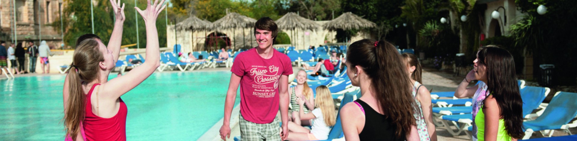 Ez a hatalmas medence rád is vár órák után! De ez nem minden! A campus területén vannak az apartmanok, az étterem, ahol a teljes ellátást kapod, a bár, ahol esténként különböző partikat tartanak, egy strandröplabda pálya, és hatalmas kert is tartozik az iskolához, ahol olykor órákat is tartanak. Minden egy helyen, hogy még kényelmesebben érezd magad.